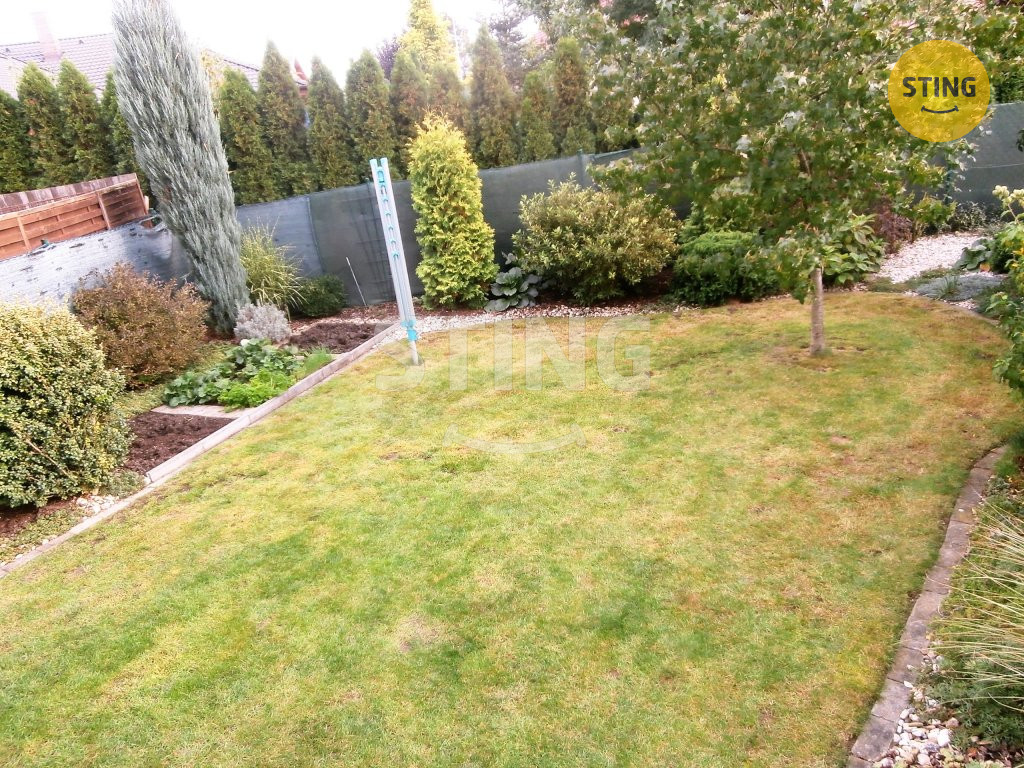 zahradě jsou vzrostlé okrasné keře a stromy, část zahrady je využívaná