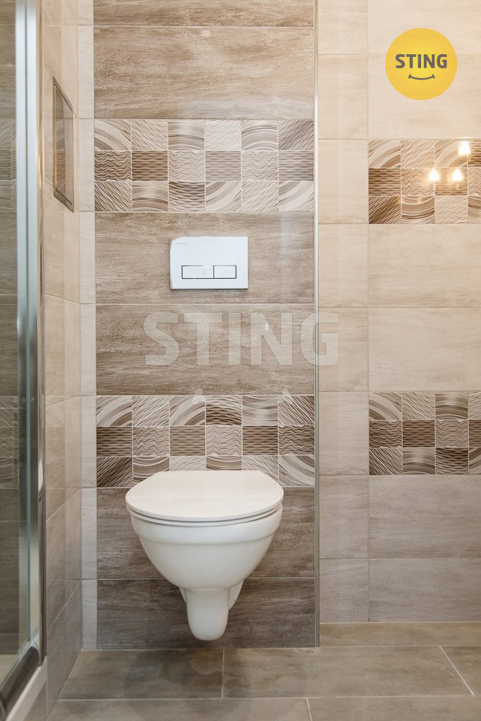 s osvětlením, závěsné WC. Obklady a dlažba v nadčasových odstínech