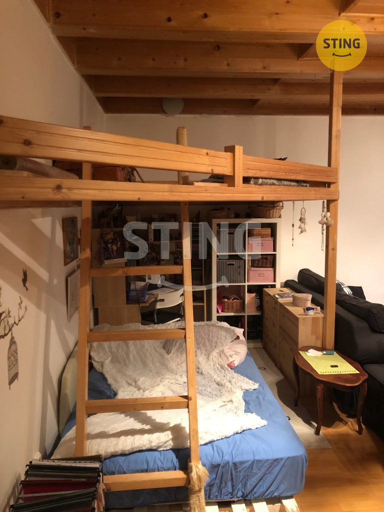 strop, na míru dělaná postel v patře. Do kuchyně se dá vejít jak