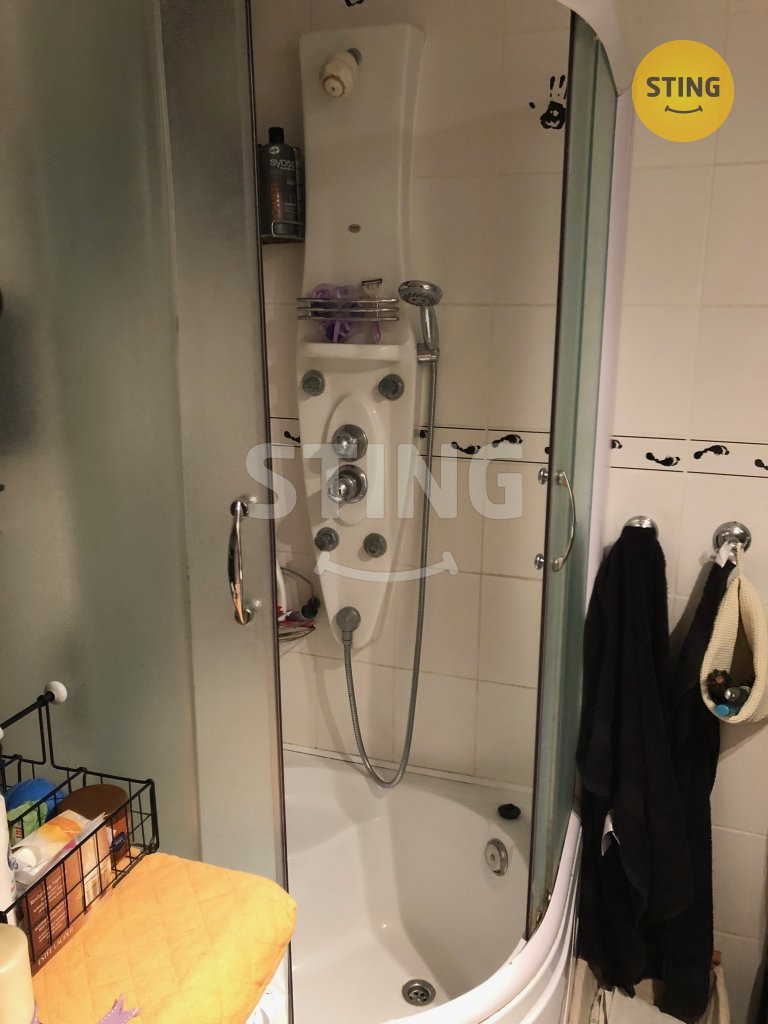 V koupelně je sprchový kout, umyvadlo a pračka. Podlahy jsou plovoucí a