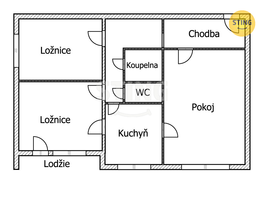 zárubně, obložky. Z pokoje je vstup na balkón. V ložnici vybudovaná