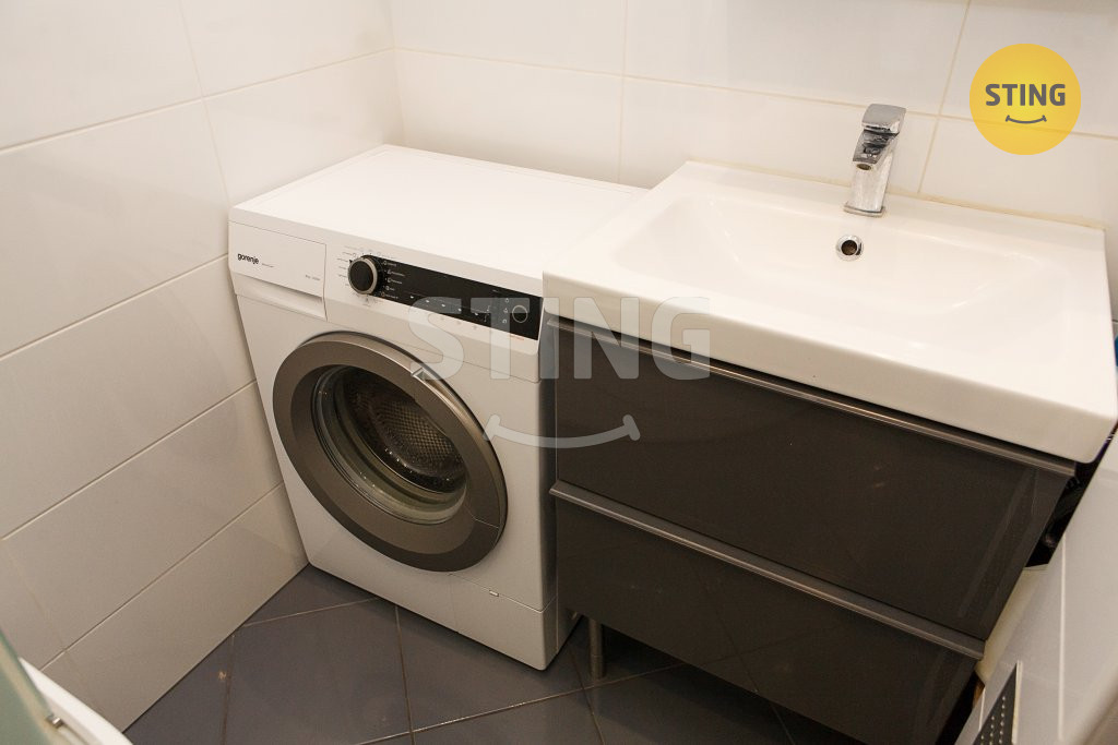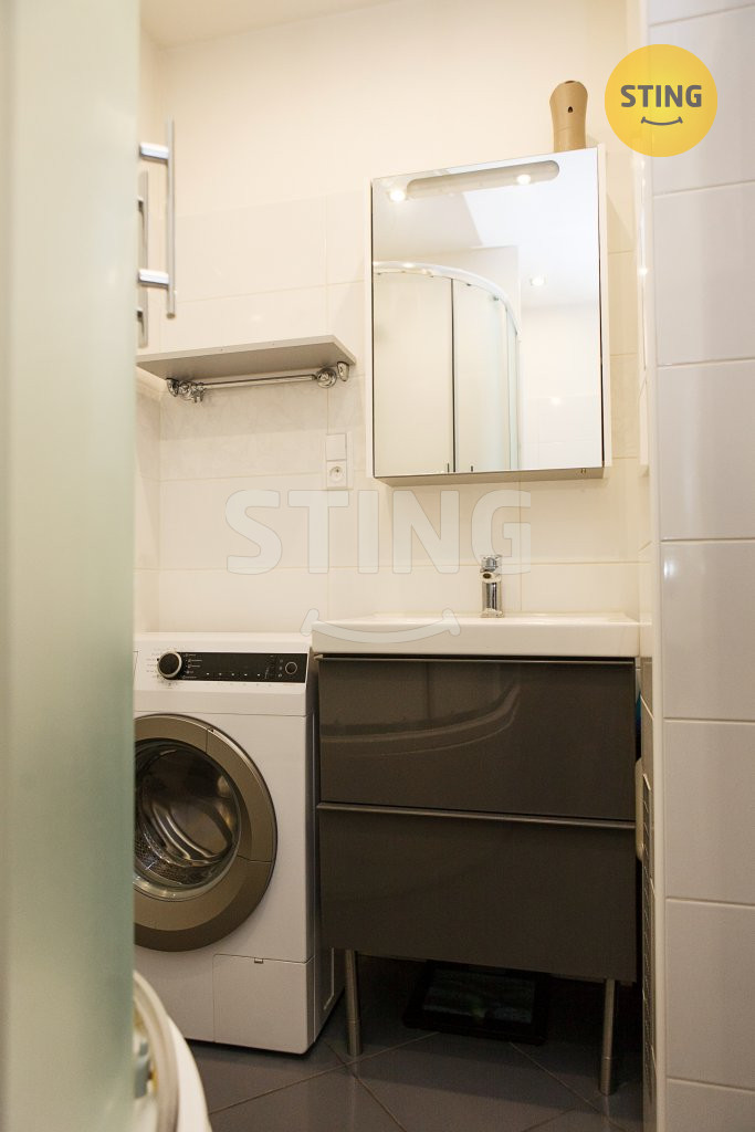 nové umyvadlo se skříňkou, zrcadlo s osvětlením, geberit. Obklady a