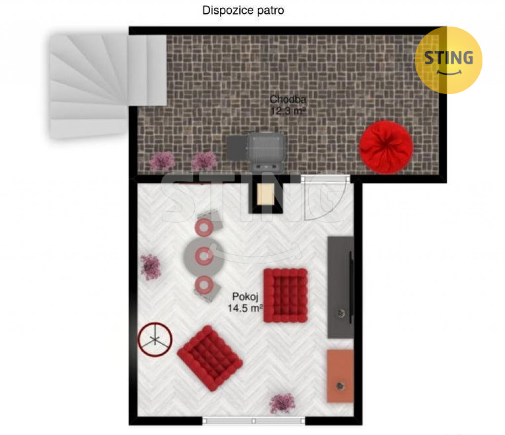 prostorná koupelna. V prvním patře je umístěn jeden pokoj a dva půdní