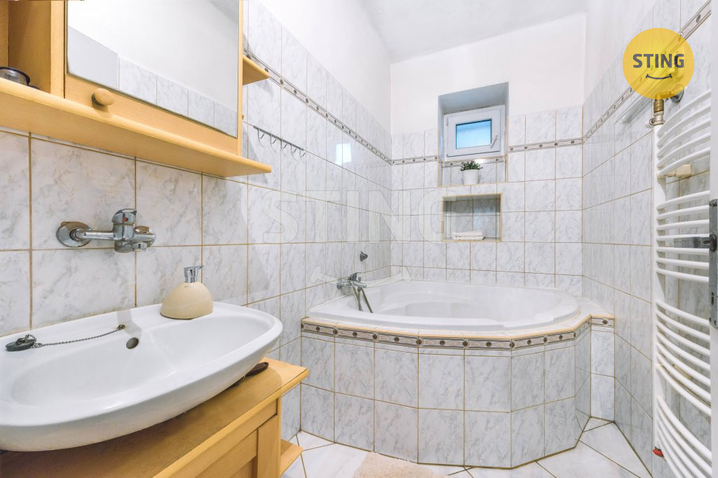 s vanou. Vytápění domu: ústřední topení s kotlem na pevná paliva.