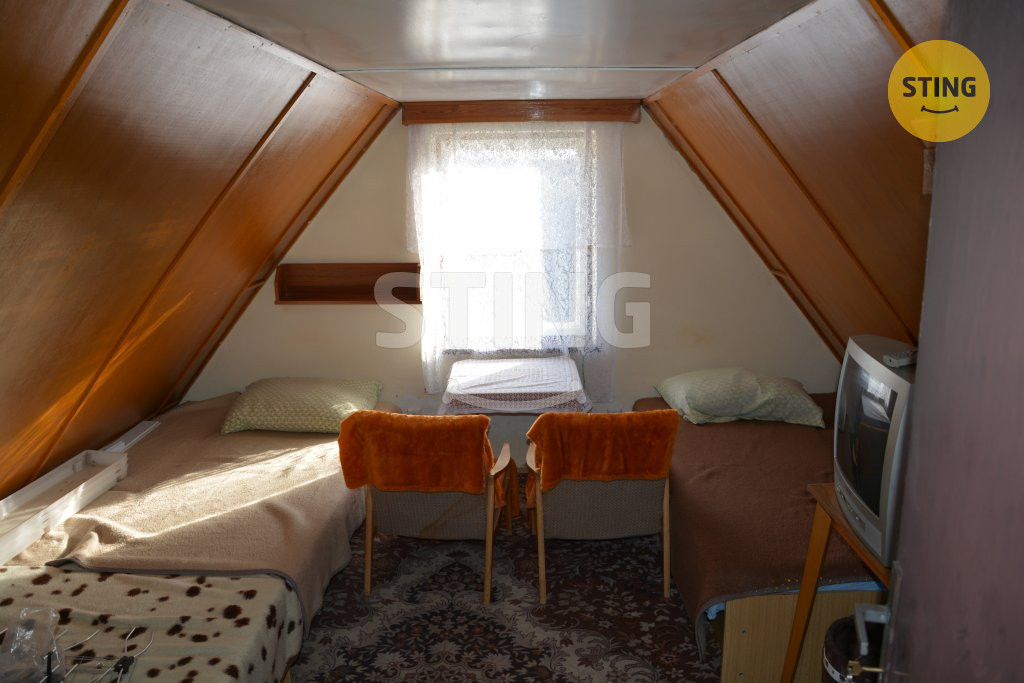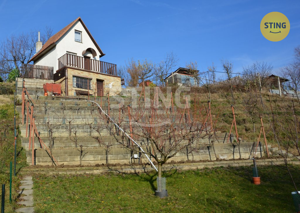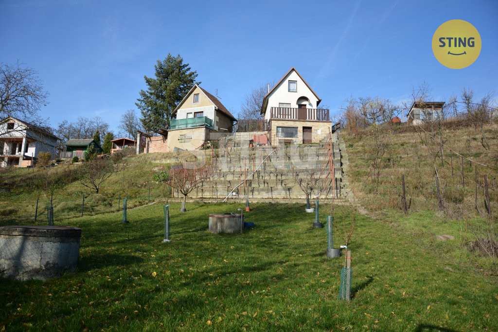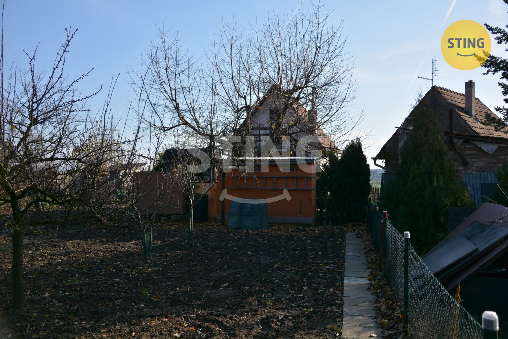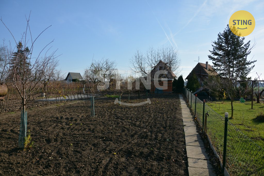 Nabízíme vám krásnou zahradu s chatou a vinohradem. Nachází se v katastru obce Lužice v části Strání. Součástí je zděná chata postavená v roce 1992. Plocha pozemku je 855m2, zastavěná plocha je 21m2. Chata je vystavěná ve svahu a tak má sklep, přízemí a vrchní patro, je celo-podsklepená. Ve sklepě se nachází přípravna na výrobu vína, dřevník, místnost na nářadí a další prostor kde bylo dříve WC, nyní zrušeno, ale odpad doveden. V přízemí se nachází větší pokoj, kde je kuchyň spojena s obývacím pokojem. Je zde kuchyňská linka s elektrickým sporákem a troubou, teče studená i teplá voda. Dále se zde nachází krb, který vytopí za chvilku celý prostor. Po schodech nahoru se dostanete do spací části, zde jsou 3 postele a skříň. Vytopit lze z krbu, vede zde komín, který je dostačující. Na pozemku je studna, samostatné WC a prostor na sprchu, která je nyní odpojená. Zahrada se skládá ze tří částí – zatravněná, užitková a terasy s vinnou révou.