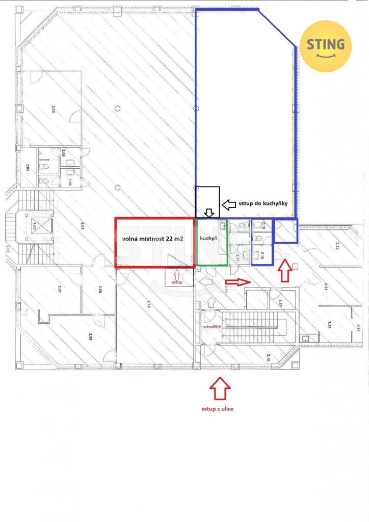 prostorech koberec a v sociálním zázemí pak dlažba. Všechny prostory jsou
