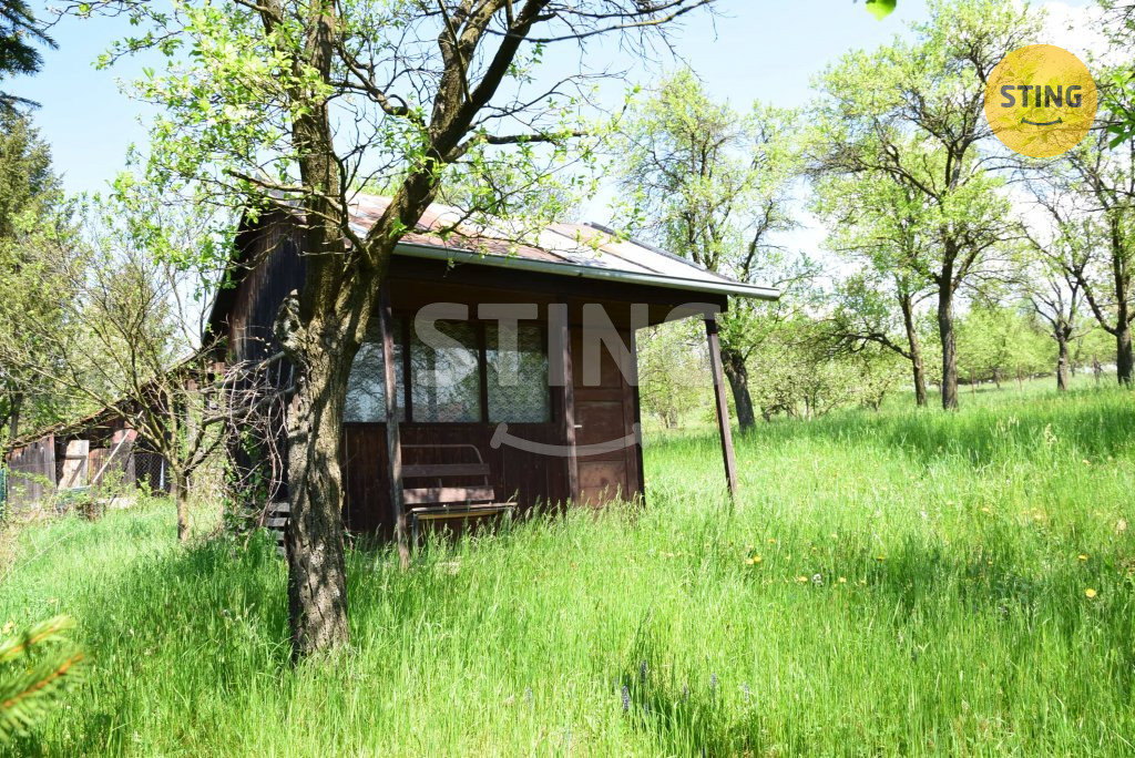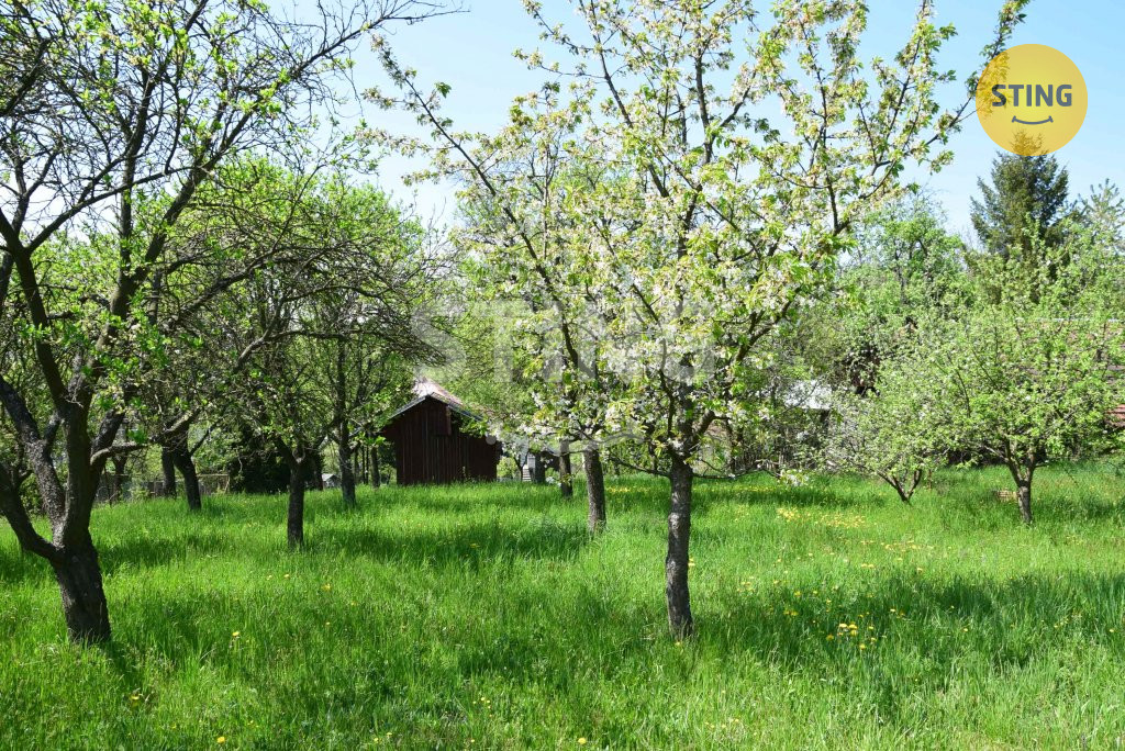 ovocné stromy a menší přízemní dřevěná chatka. Okolní zástavbu