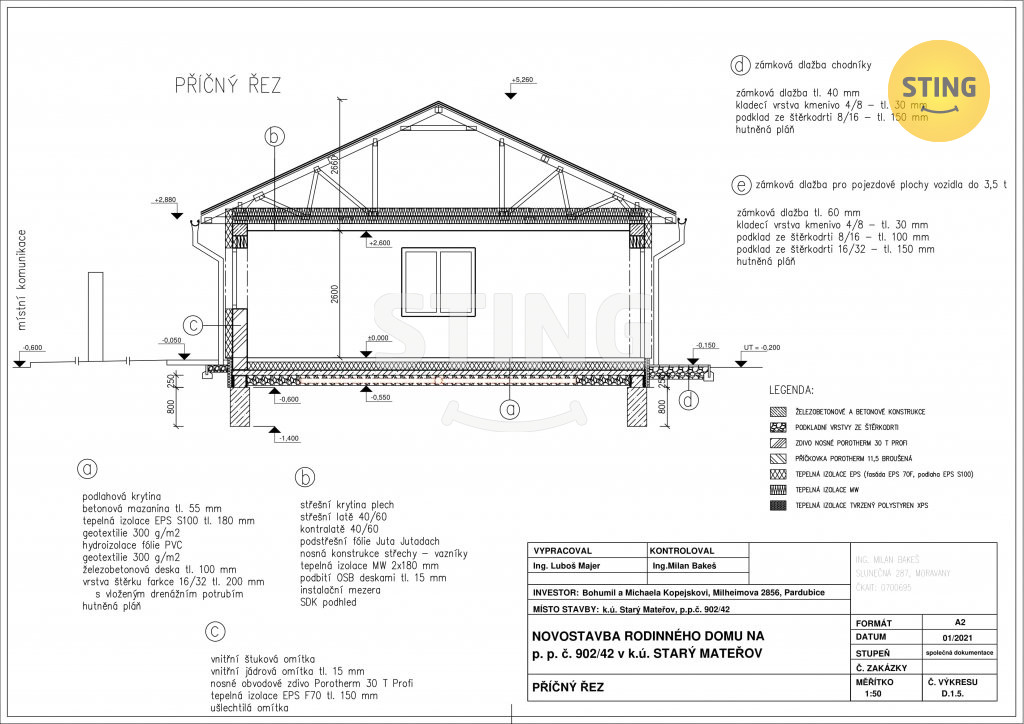 Nabízíme k prodeji novostavbu rodinného domu v obci Starý Máteřov o zastavěné ploše cca 130 m2 na pozemku o celkové rozloze 503 m2. Výstavba tohoto domu (obytná plocha 104 m2) byla započata 1/2022. Plánované dokončení stavby 5–6/2022. Jedná se o novostavbu (bungalov) o dispozici 4+kk v nově vzniklé části obce. Dům bude postaven z porothermu (30cm) a zateplen vatou (15 cm). Střecha valbová (betonová taška černé barvy). Okna plastová. Podlahové vytápění řešeno tepelným čerpadlem. V ceně je kompletně dokončený (včetně koupelny a toalety) dům bez kuchyňské linky. Na pozemku budou vybudovány chodníky a 2 parkovací stání (zámková dlažba). V obci je občanská vybavenost (školka, obchod, domov pro seniory, hospoda, MHD). Pro další informace kontaktujte makléře.