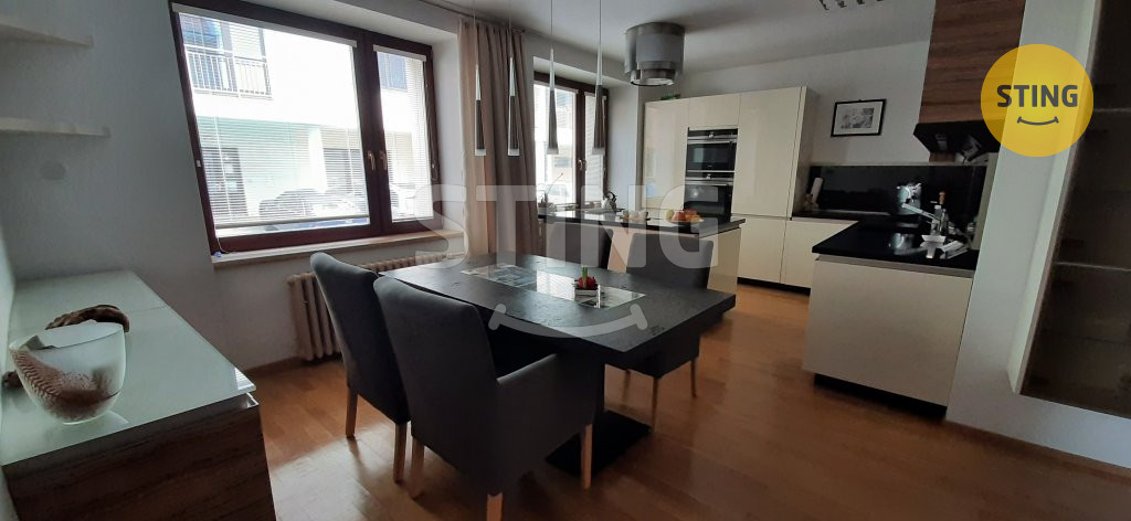 prostornou jídelní část, která navazuje na obývací pokoj. Z něj je
