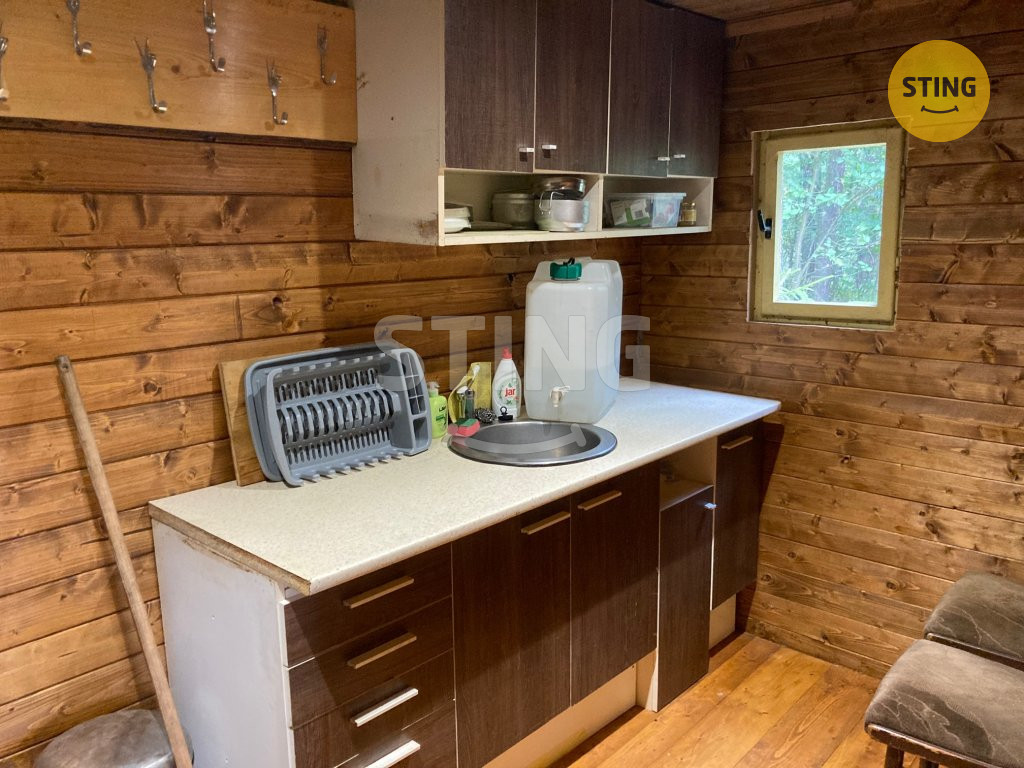 včetně podlahy je obložen dřevem. Je vybavena kuchyňskou linkou, úložnou