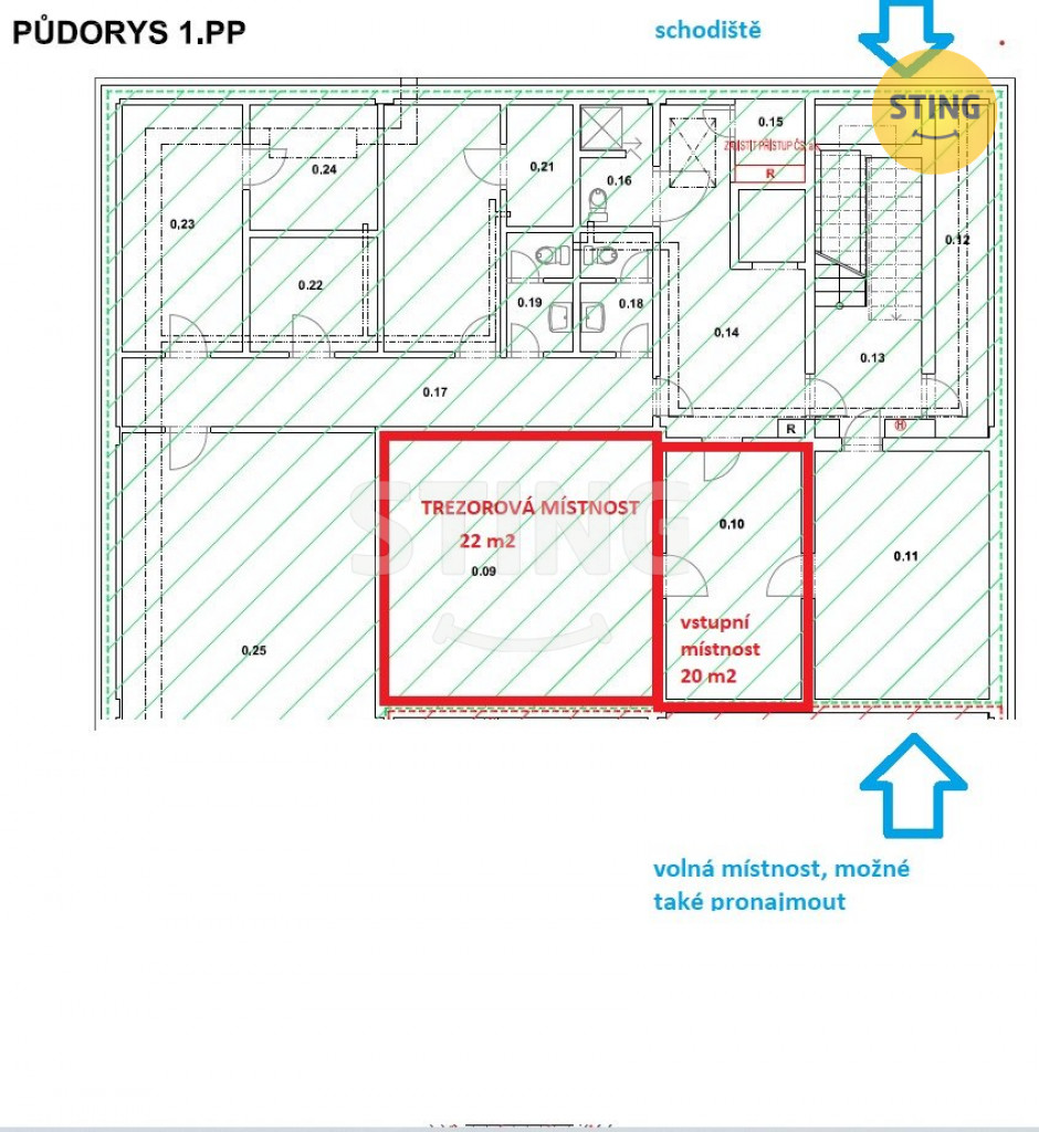 Trezor navazuje na vstupní místnost o velikosti cca 20 m2, která