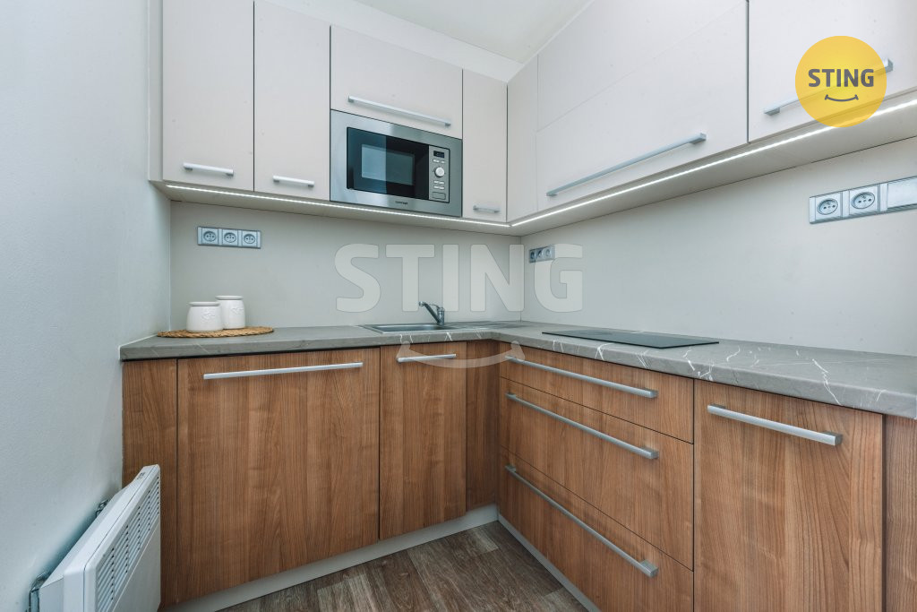 linky se spotřebiči (vestavná lednice a varná deska), v koupelně je vana,