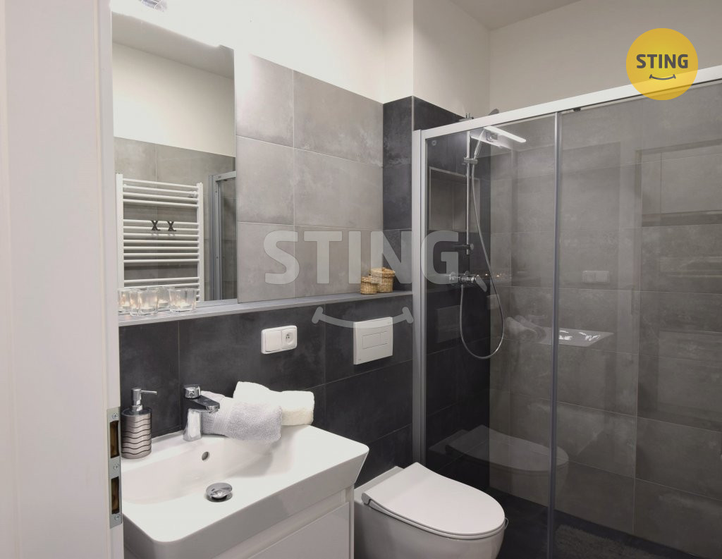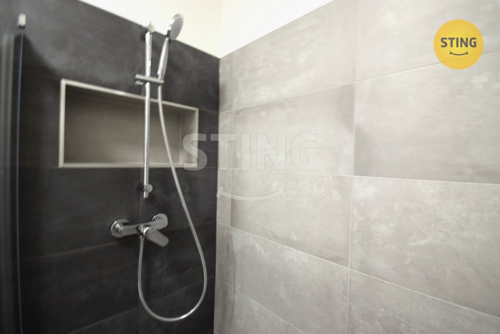 Koupelna je vybavena zaskleným sprchovým koutem, otopným žebříkem a je