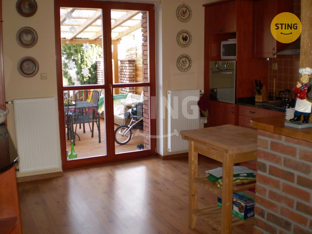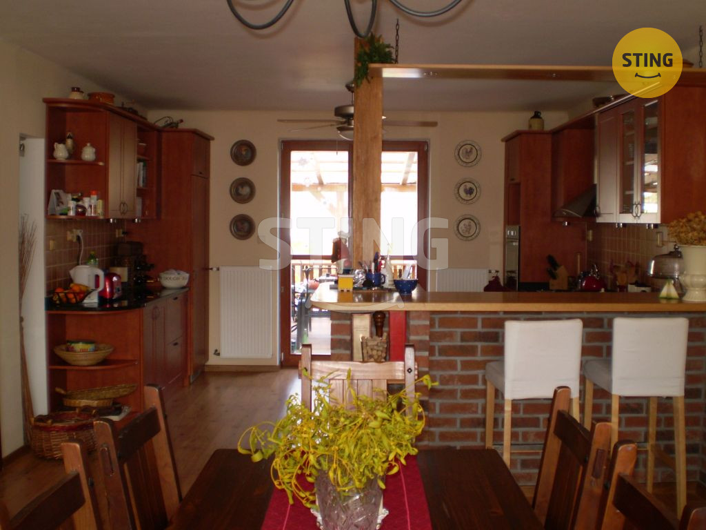 V kuchyni jsou francouzská okna a dá se projít na krytou dřevěnou terasu