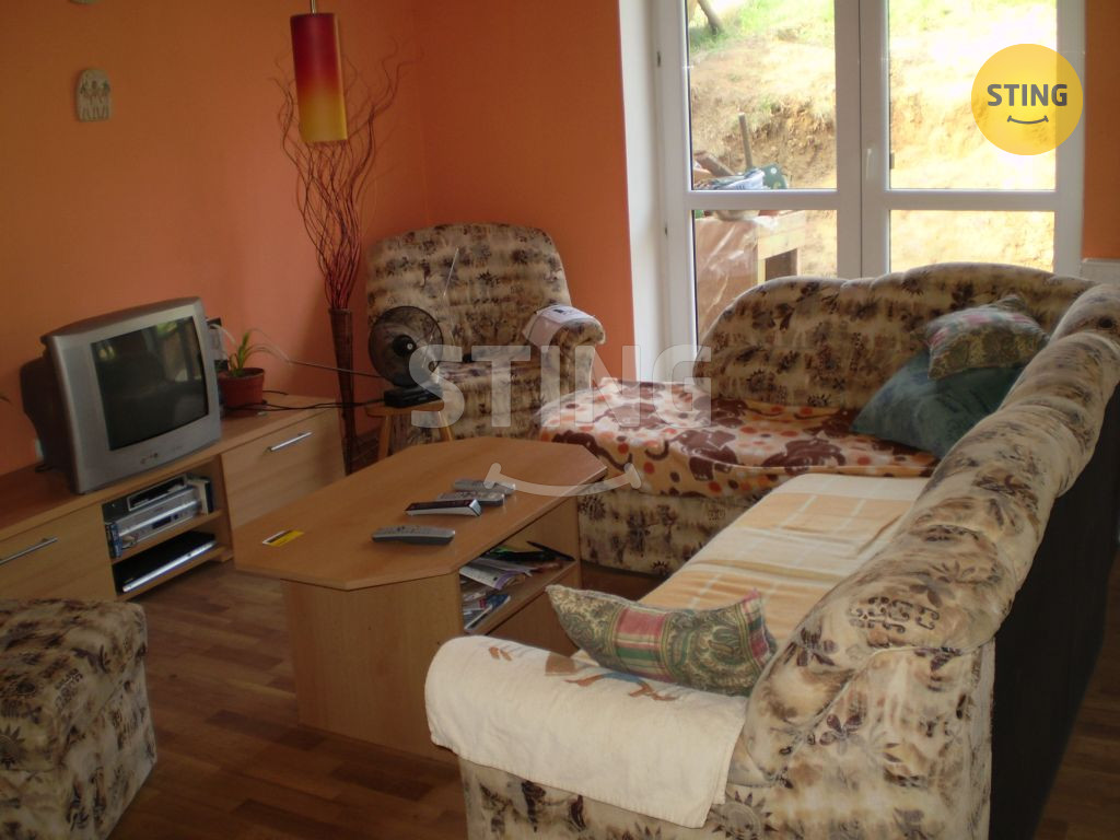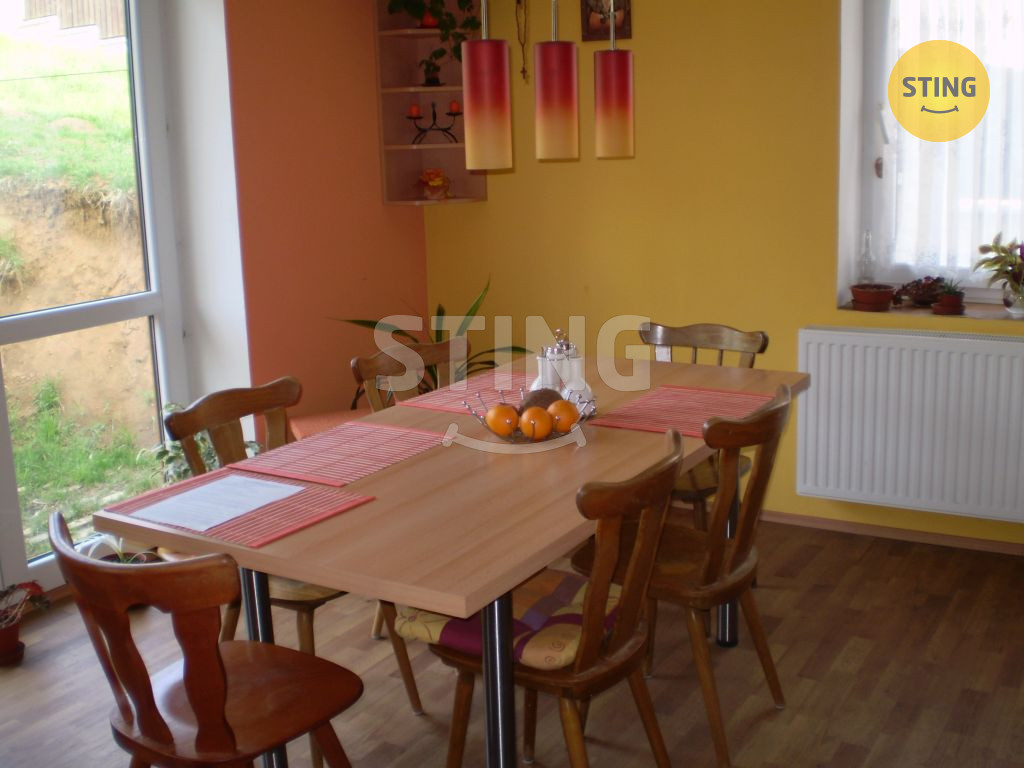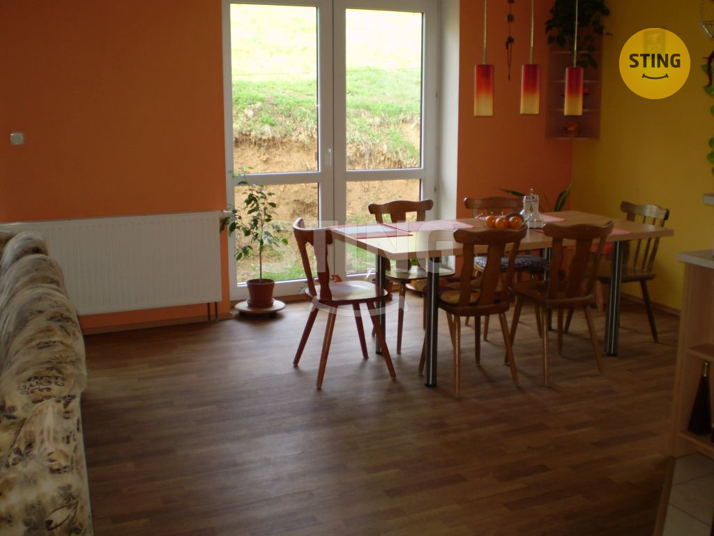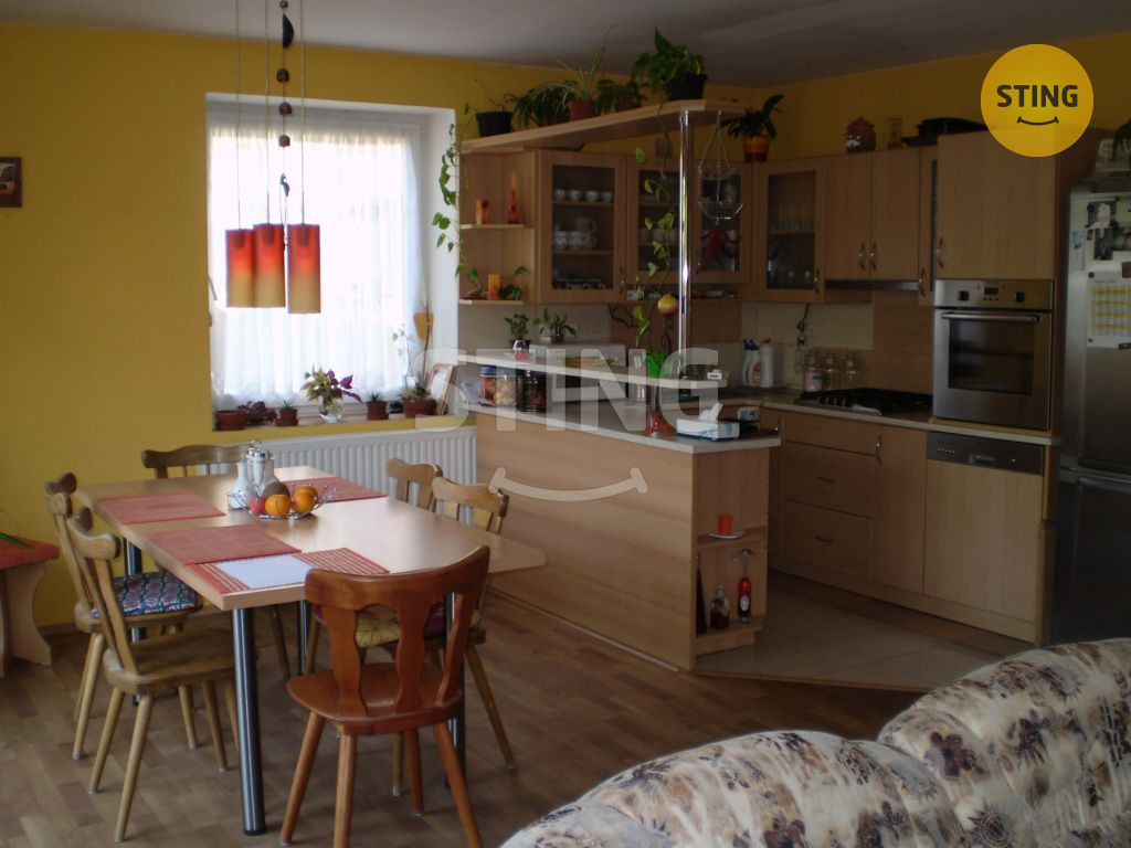s kuchyní a prostorným jídelním koutem. Součástí obývacího pokoje je