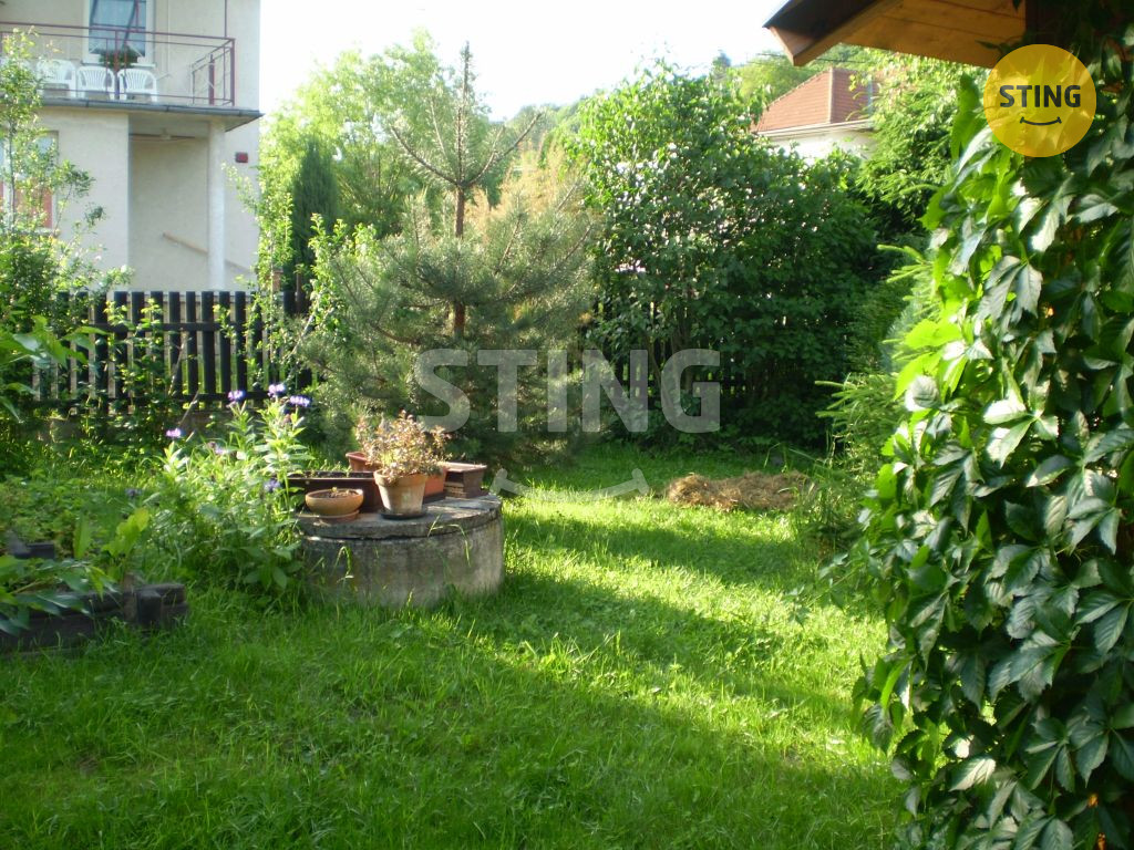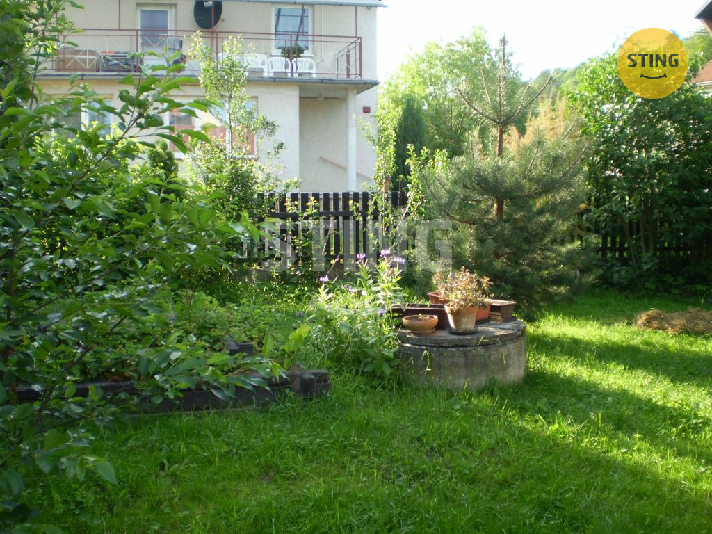 vstupním prostorem. Za domem je oplocená okrasná zahrada s ovocnými stromy
