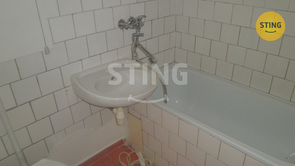 dlažba, WC, odpady i voda v plastu, v koupelně je okno. Klidný a čistý