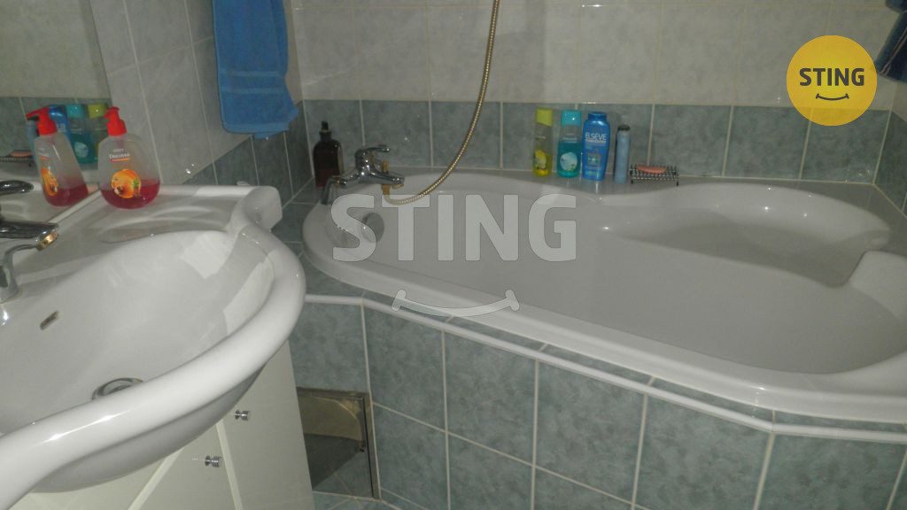 položena dlažba. Koupelna – po rekonstrukci, rohová vana, umyvadlo se