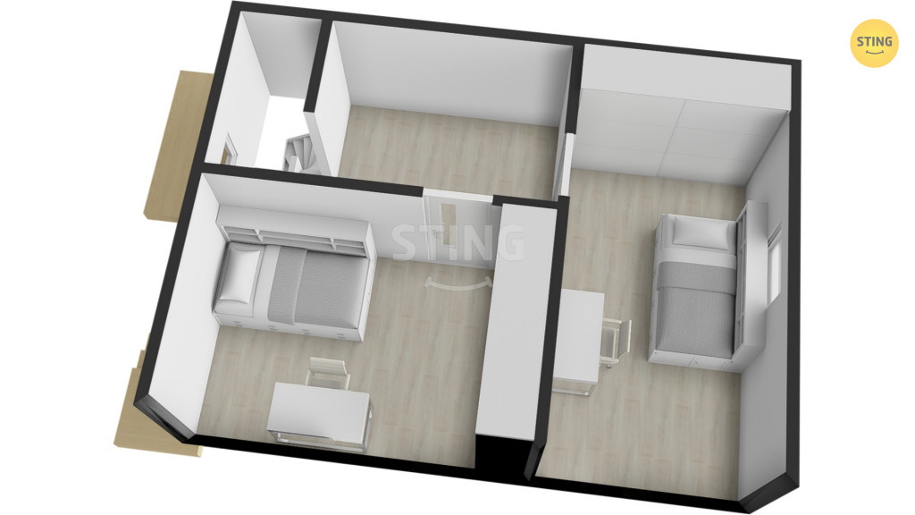 Dispozice bytu tvoří vstupní chodba, obývací pokoj s kuchyňským koutem,