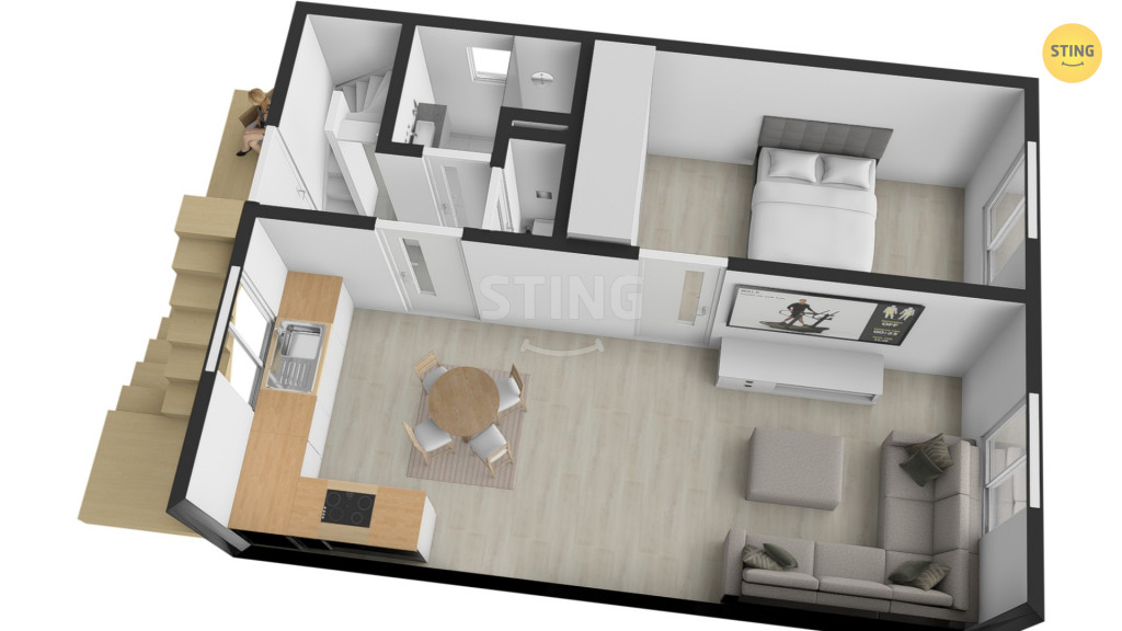 jednotka má vlastní samostatný vstup přes venkovní schodiště, což