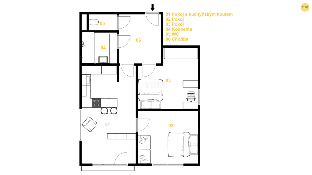 světovou stranu a také neprůchozí pokoje. Ve všech obytných místnostech