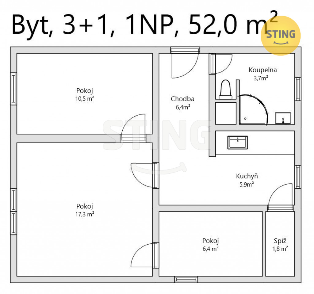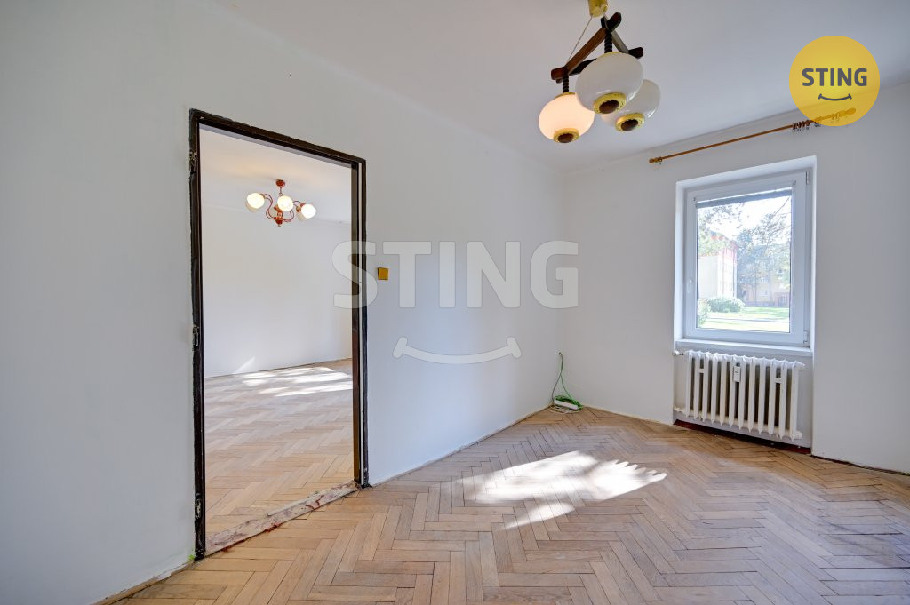 s WC, kuchyň se spíží, prostorný obývací pokoj a dva samostatné pokoje.
