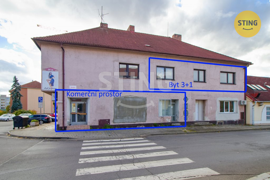 V přízemí domu se nachází komerční prostor se dvěma vstupy a výlohami