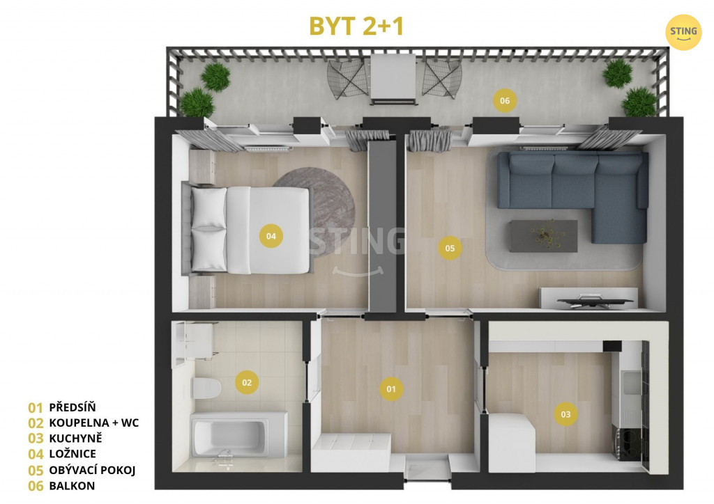 koupelnu s vanou a WC. Velký balkón nabízí nádherný výhled a příjemnou