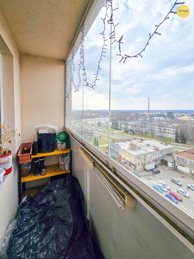 balkónem, který se nachází v 10. patře domu s výtahem na ulici