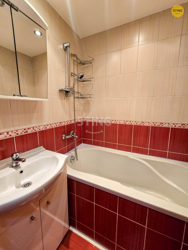 se nachází vana a umyvadlo se skříňkou, zrcadlová skříňka s úložným