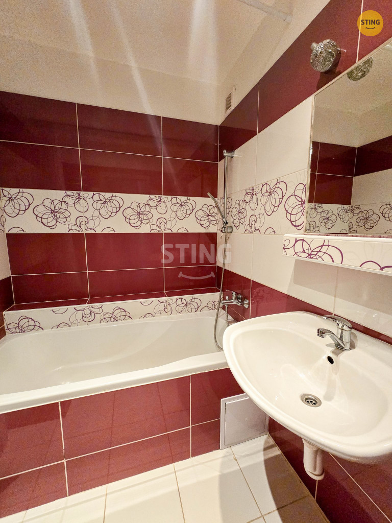 Koupelna je zděná, v obkladech a s dlažbou, má vanu i umyvadlo a je ve