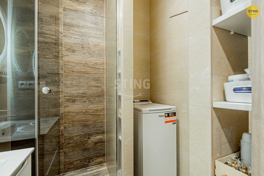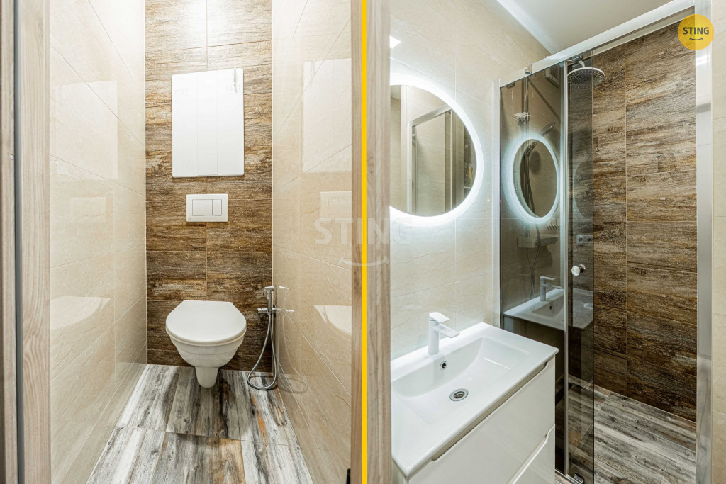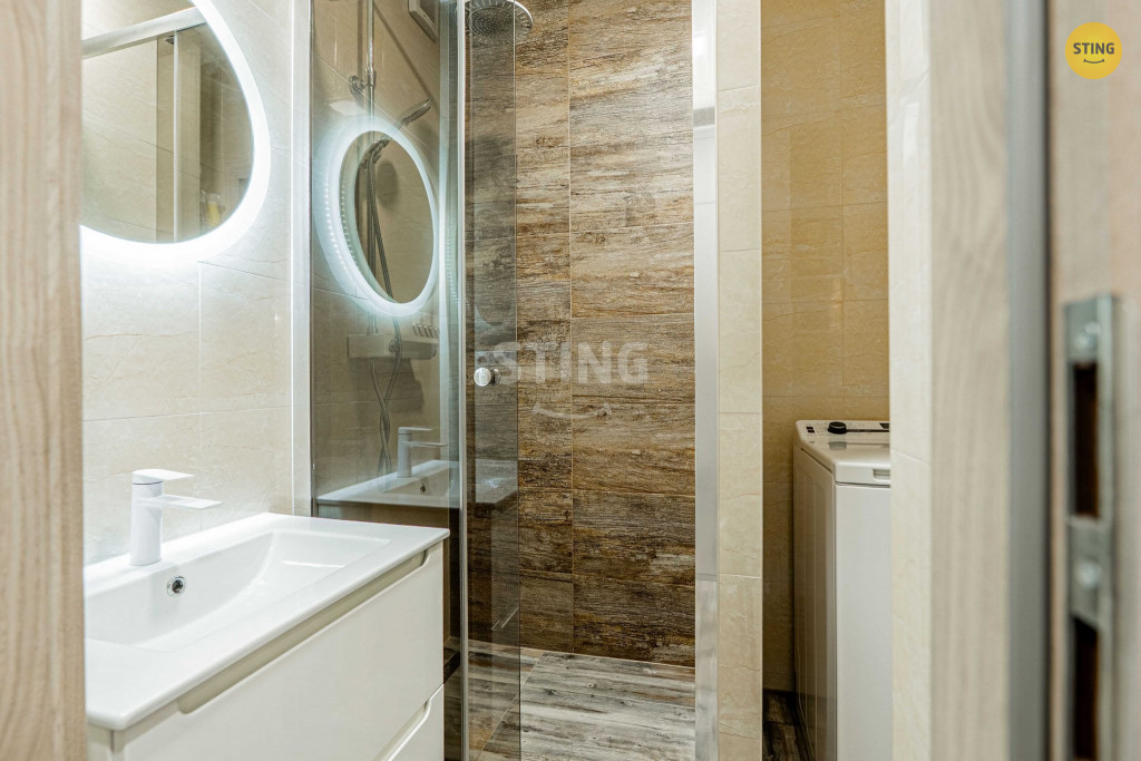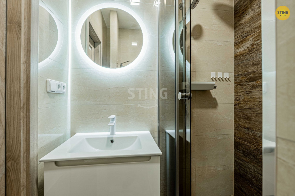 kuchyňská linka i vkusně řešená koupelna se sprchovým koutem,
