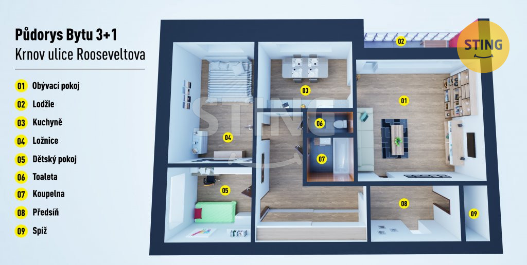 pokoj, koupelna a WC. Dominantou bytu je prostorná lodžie, která nabízí