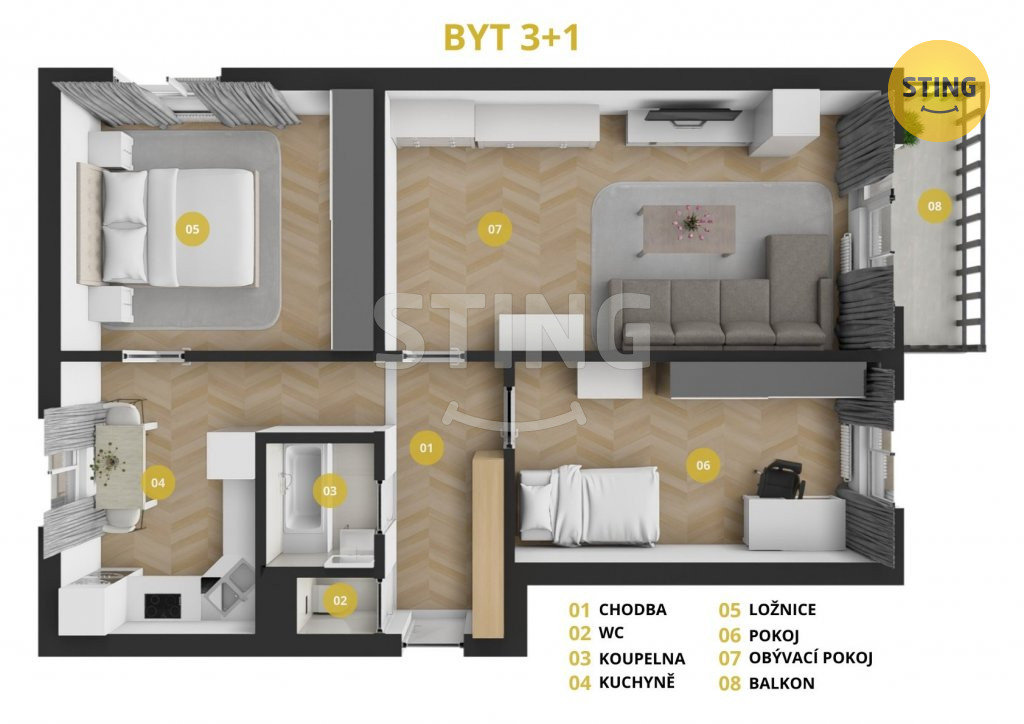 Žádný z pokojů není průchozí. Ze světlého obývacího pokoje je vstup