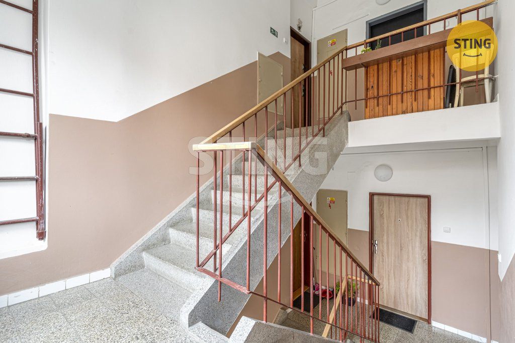 ve 3. nadzemním podlaží cihlového domu s vysokou valbovou střechou. Byt