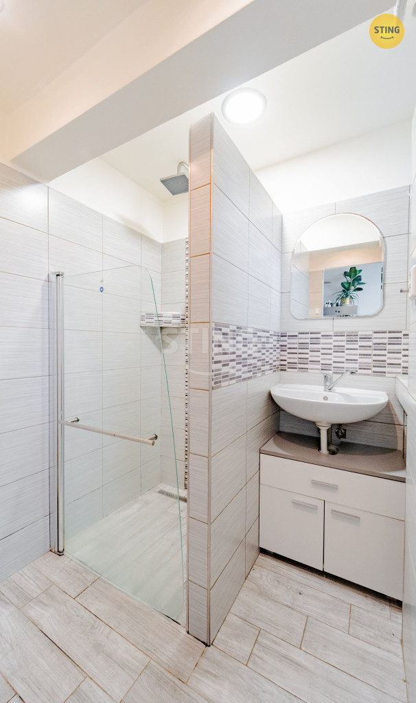 dalšího pokoje. Z kuchyně se vstupuje do koupelny se sprchovým koutem a