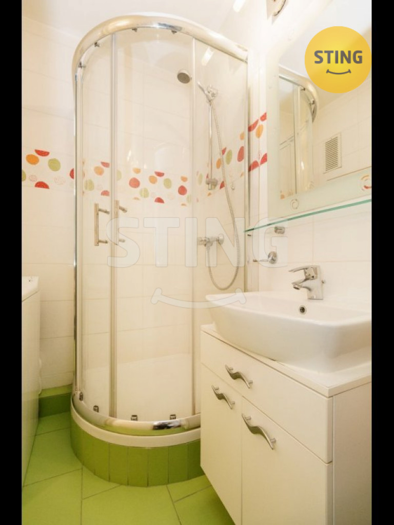 Koupelna: sprchovací kout, umyvadlo se skříňkou, prostor pro pračku