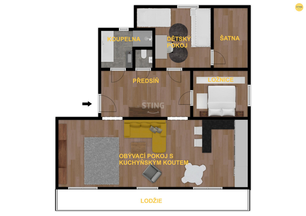 • velkorysý obývací prostor se vstupem na prostornou lodžii (el.