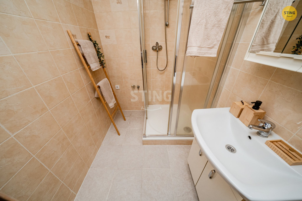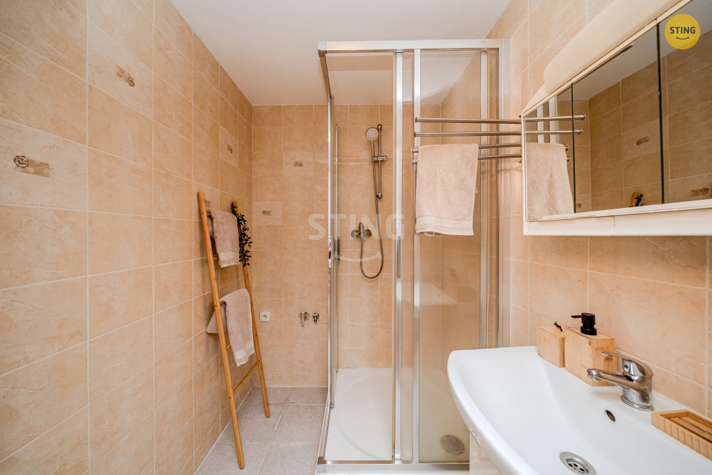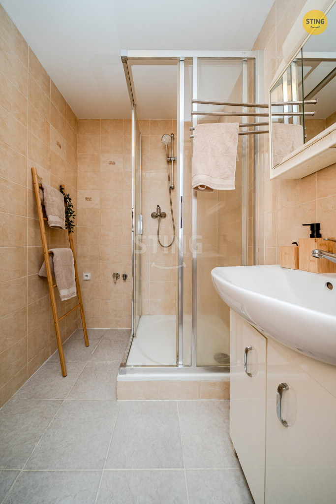 troubou, příprava na vestavěnou lednici, koupelna se sprchovým koutem,