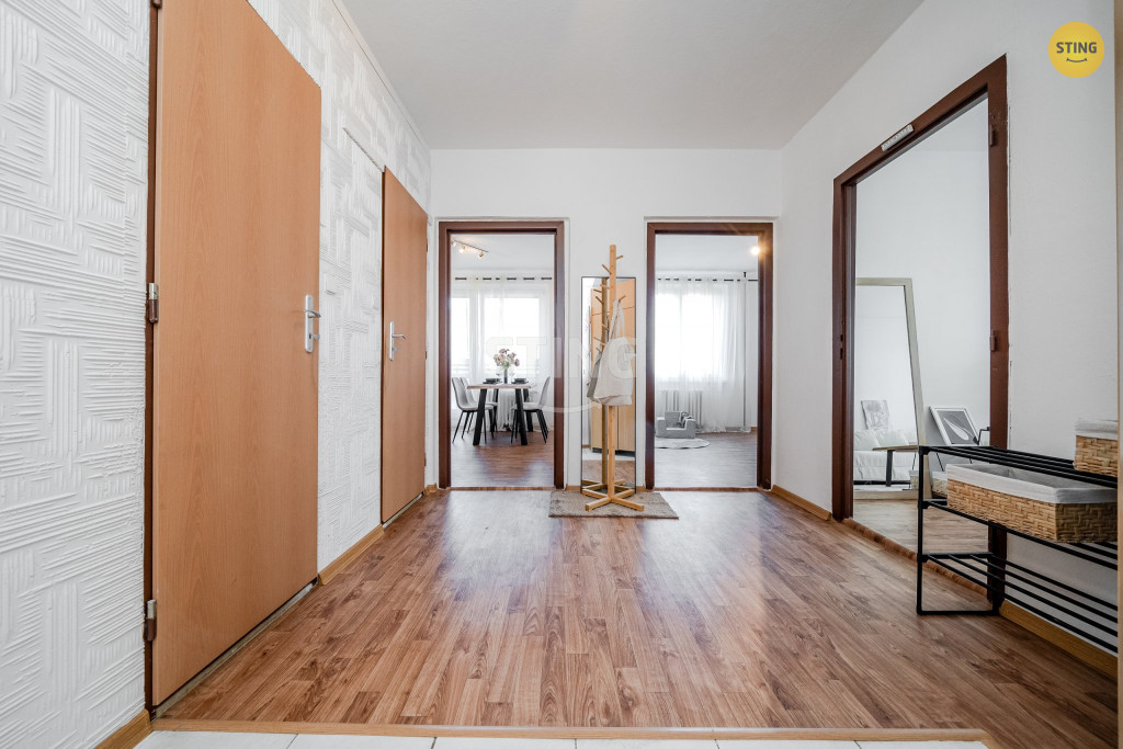 Při vstupu do bytu se nachází prostorná chodba s vestavěnou skříni.
