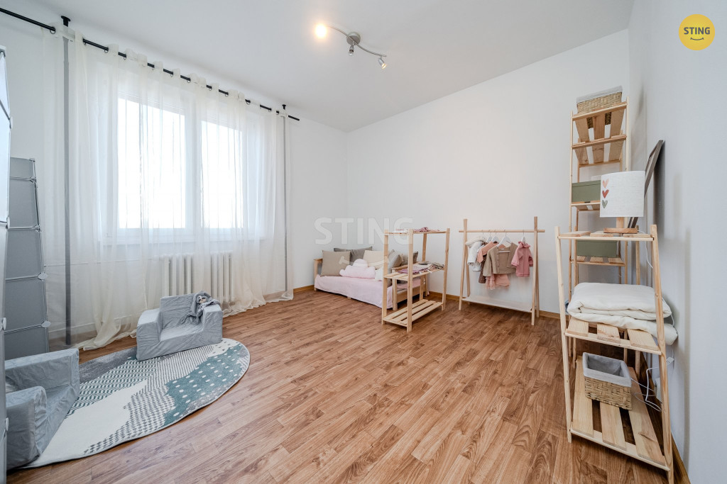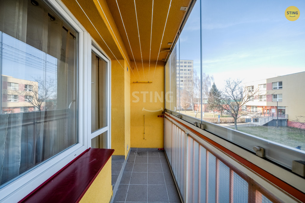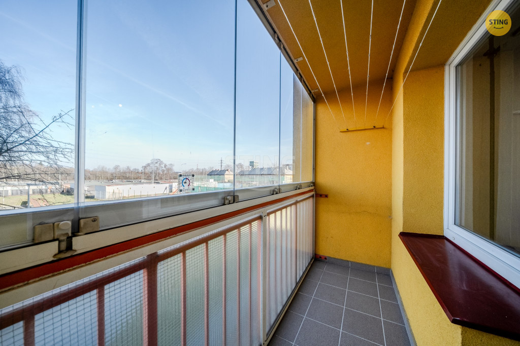 Dominantou bytu je velká zasklená lodžie s výhledem na hřiště, která