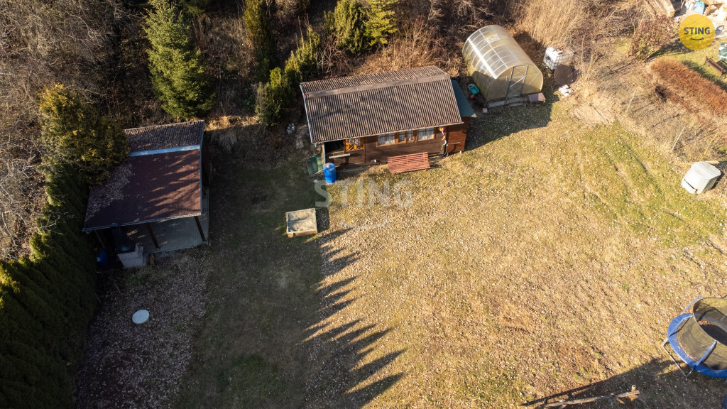 Na pozemku se nachází dřevěná chata s verandou, která nabízí