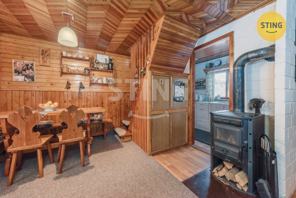samostatné WC, hlavní obývací místnost s krbovými kamny a schodištěm do