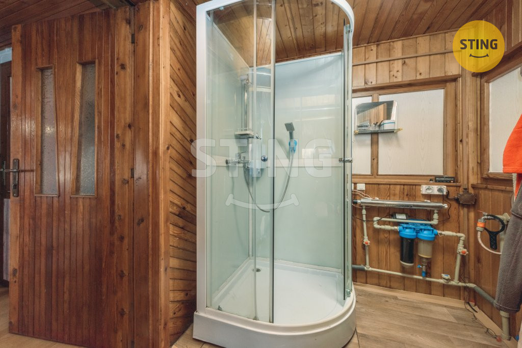Dispozice chaty: v 1.NP se nachází vstupní zádveří se sprchovým koutem,