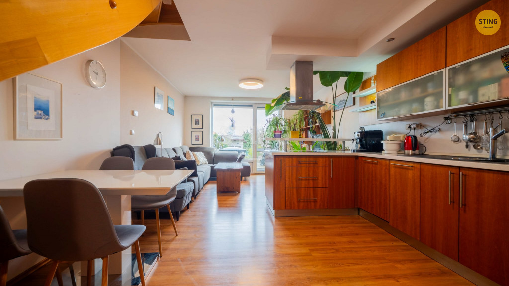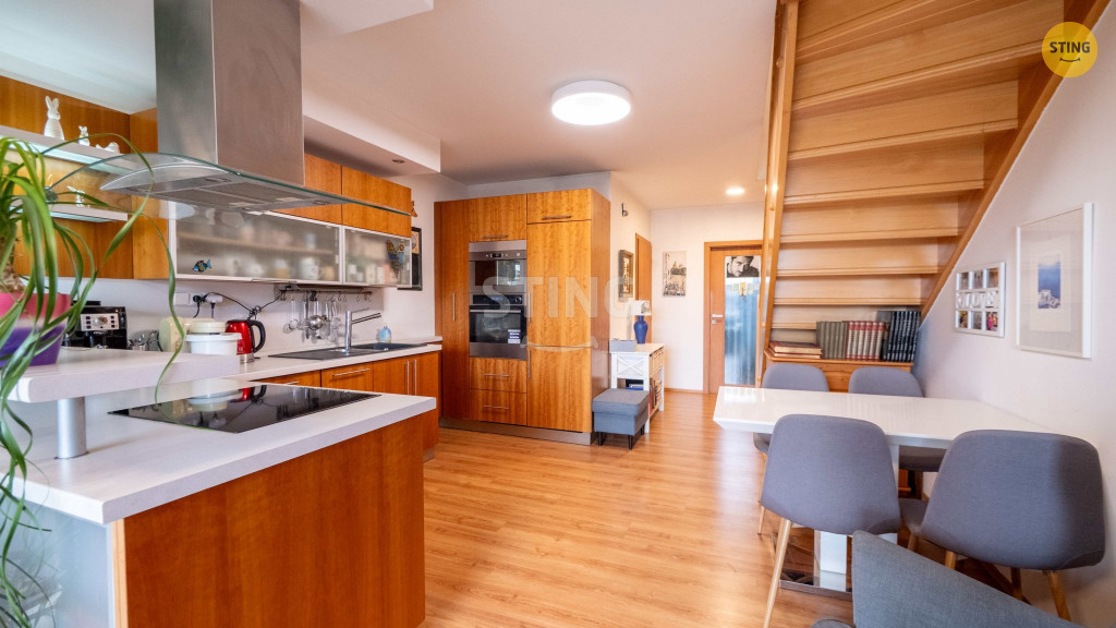 s kuchyní a jídelnou. Z obývacího pokoje je přímý vstup na terasu, kde