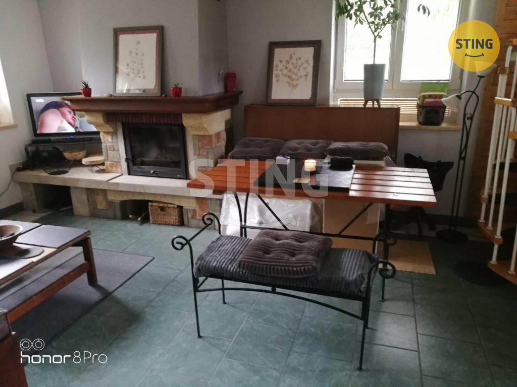 prostorný obývací pokoj, jehož dominantou je krb, jenž dokáže vytopit