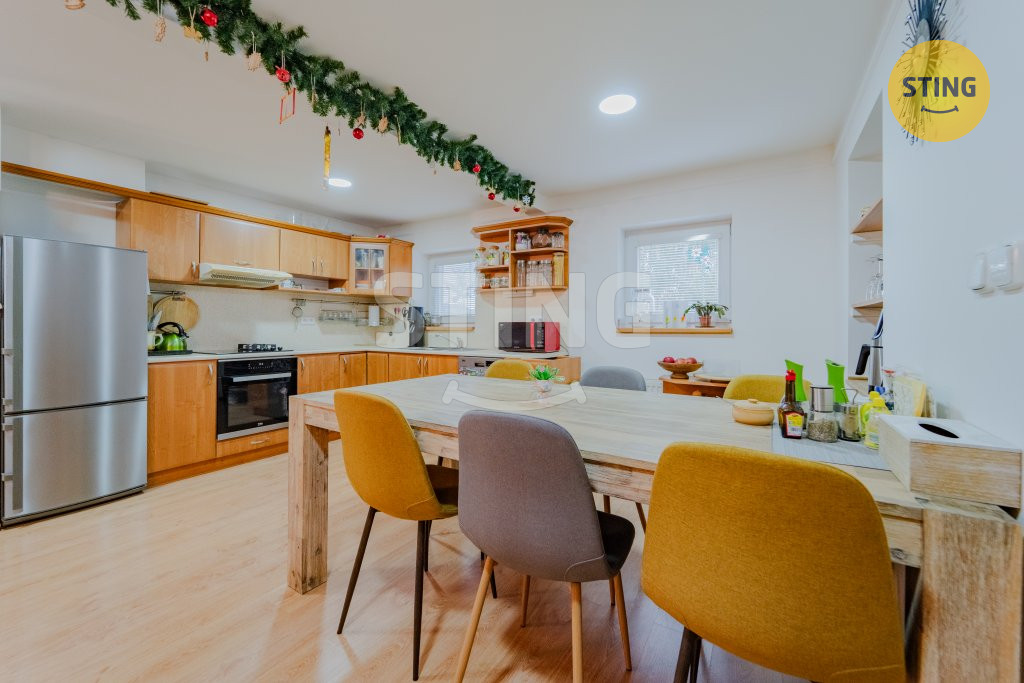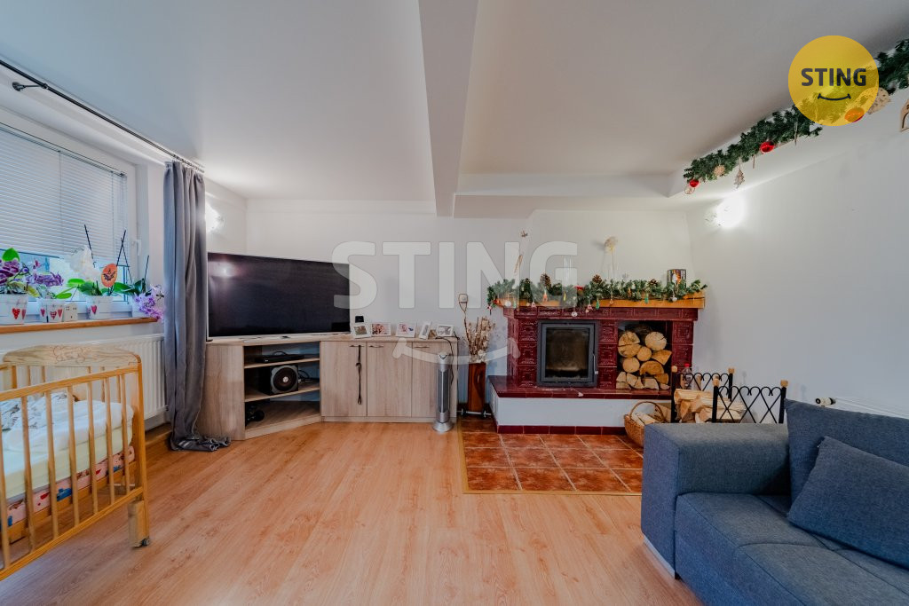 doplňuje krb. Dále koupelna, samostatné WC, špajz a jeden pokoj.
