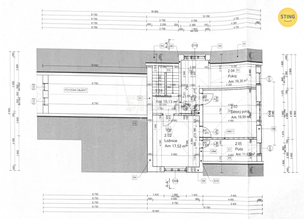2.NP: dětský pokoj (19,99 m2), ložnice (17,52 m2),