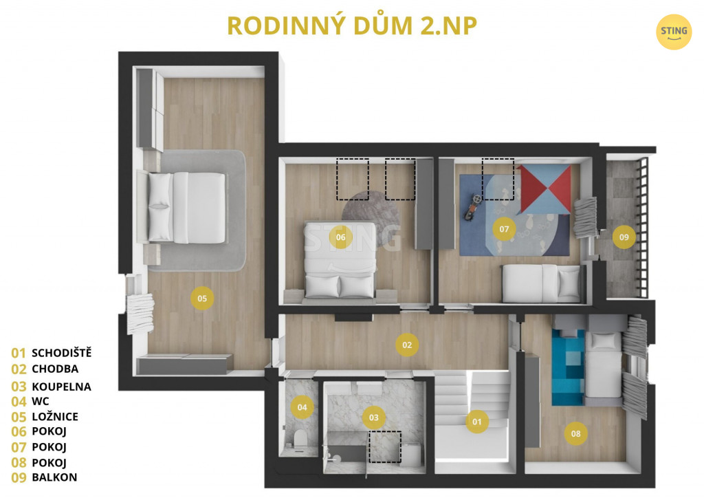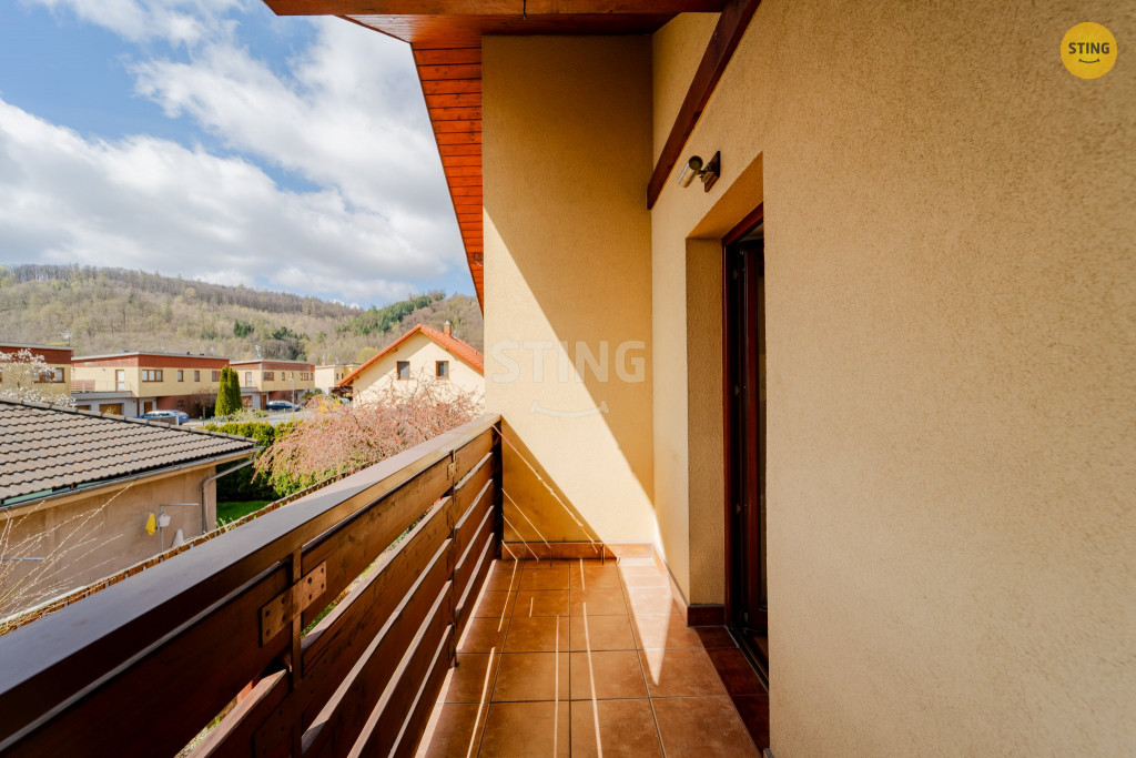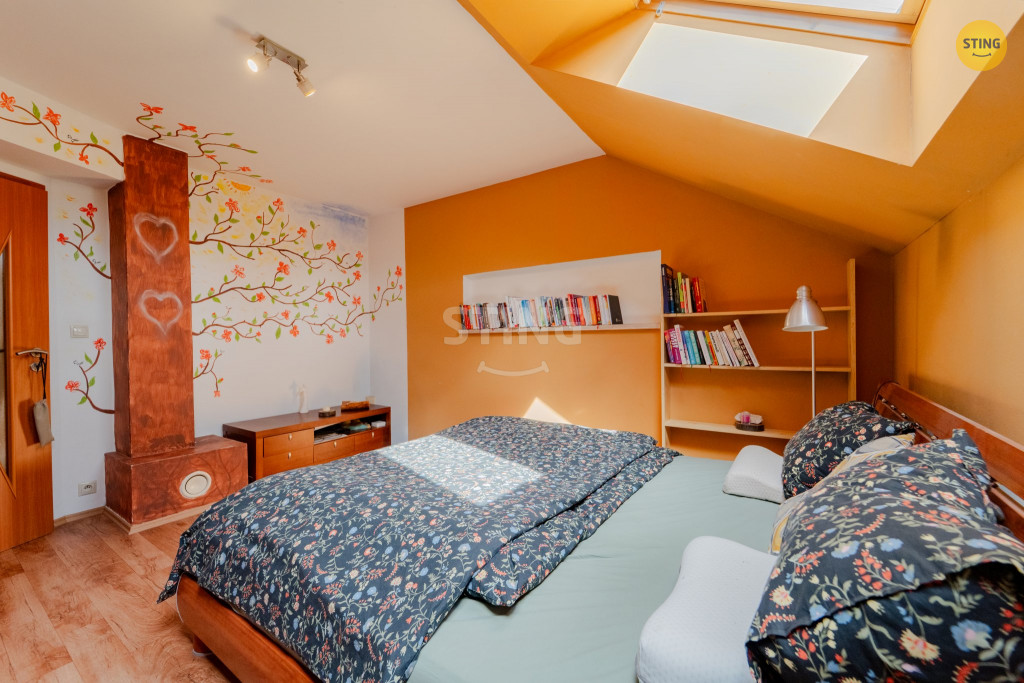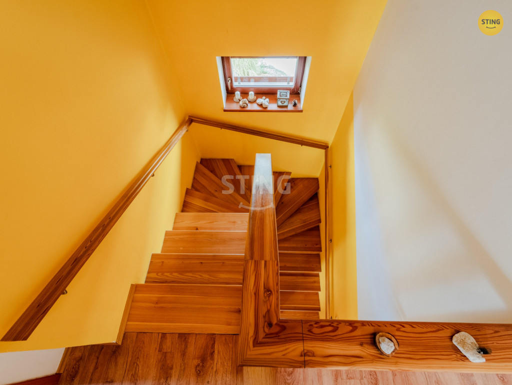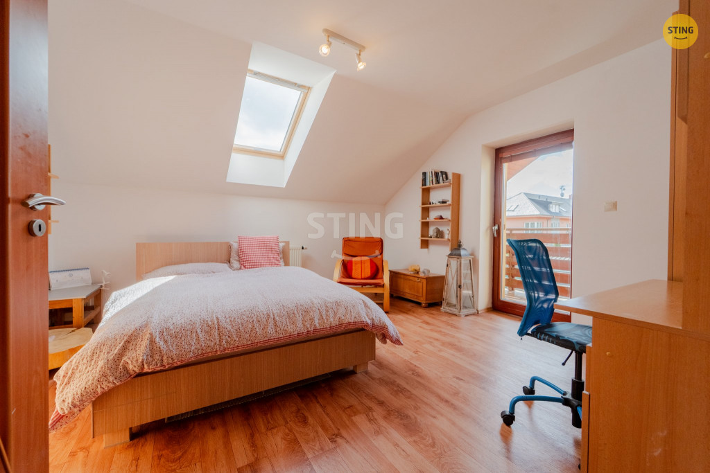 V patře jsou tři samostatné pokoje (jeden s vlastním balkónem),