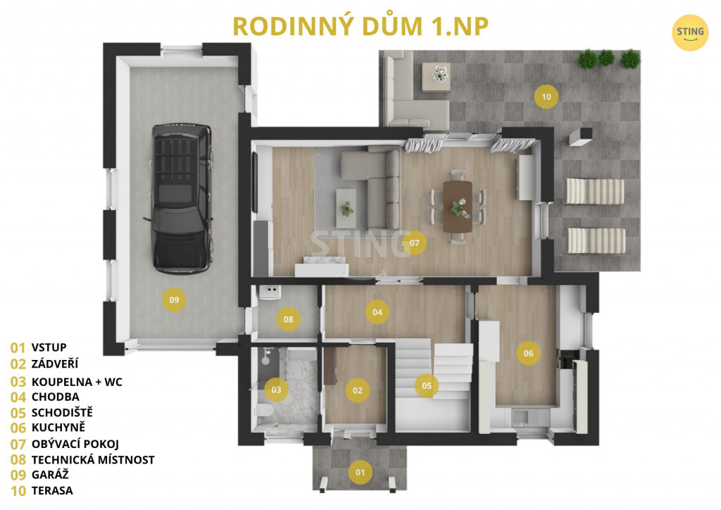 a průchod do velké garáže, která komfortně pojme vůz i úložné